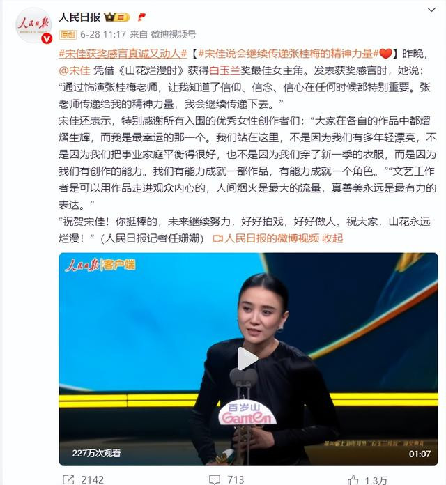 这话呼应的,正是宋佳在领奖台上那段不卑不亢的发言。