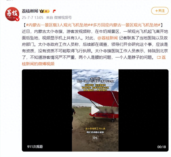 近日,内蒙古太仆寺旗,游客发视频称,在牛奶湖景区,一架观光飞机起飞离开地面后坠地,视频显示机上共有3人。对此,@荔枝新闻记者联系了当地医院以及政府部门。太仆寺政府工作人员称,后续都在调查,领导们开会研究这个事亿融配资,应该是有资质,没有资质不可能取得飞行执照。太仆寺旗医院工作人员表示,转院到北京了,不知道游客情况严不严重,两个人是腰的问题,一个人是脖子的问题。
